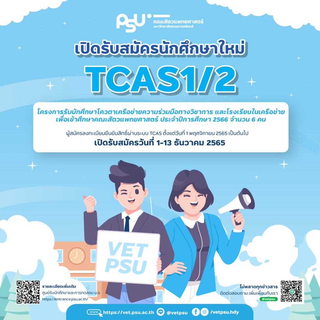 ประกาศรับสมัครนักศึกษาใหม่ รอบที่1/2 ประจำปีการศึกษา 2566 #โครงการรับนักศึกษาโควตาเครือข่ายความร่วมมือทางวิชาการ และโรงเรียนในเครือข่าย 💙เข้าศึกษาหลักสูตรสัตวแพทยศาสตรบัณฑิต คณะสัตวแพทยศาสตร์ มหาวิทยาลัยสงขลานครินทร์ จำนวน 6 คน.🌟ผู้สมัครลงทะเบียนเพื่อยืนยันสิทธิ์ ตั้งแต่วันที่ 1 พฤศจิกายน 2565 เป็นต้นไป : ผ่าน https://student.mytcas.com🌟 เปิดรับสมัครวันที่ 1-13 ธันวาคม 2565 : ผ่านระบบ https://e-admission.psu.ac.th📌 รายละเอียดเพิ่มเติมได้ที่ ศูนย์รับนักศึกษาและการทดสอบ ม.อ. : https://entrance.psu.ac.th/.คณะสัตวแพทยศาสตร์ มหาวิทยาลัยสงขลานครินทร์ #VETPSULine : @vetpsu [https://lin.ee/PpOe4Ps ]โทร : 074-289600 More To Explore