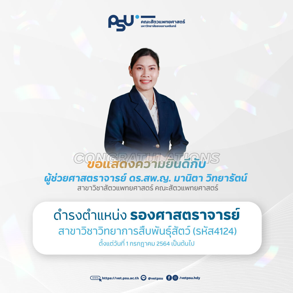 #คณะสัตวแพทยศาสตร์ ขอแสดงความยินดีกับ ผู้ช่วยศาสตราจารย์ ดร.สพ.ญ. มานิตา วิทยารัตน์สาขาวิชาสัตวแพทยศาสตร์ ดำรงตำแหน่ง #รองศาสตราจารย์.สาขาวิชาวิทยาการสืบพันธุ์สัตว์ (รหัส4124)ตั้งแต่วันที่ 1 กรกฎาคม 2564 เป็นต้นไป.คณะสัตวแพทยศาสตร์ มหาวิทยาลัยสงขลานครินทร์ #VETPSULine : @vetpsu [ https://lin.ee/PpOe4Ps ]โทร : 074-289600 More To Explore