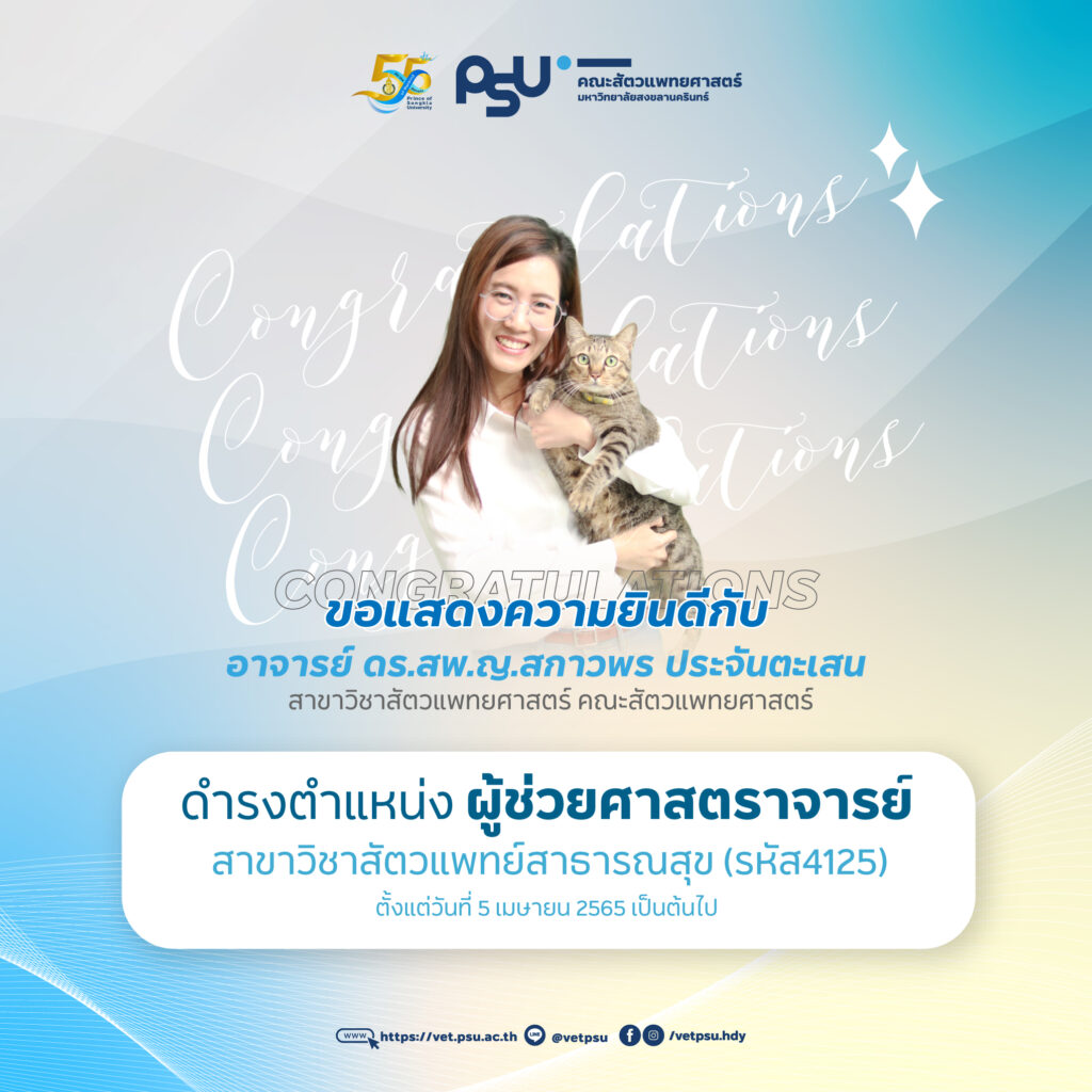 คณะสัตวแพทยศาสตร์ ขอแสดงความยินดีกับ อาจารย์ ดร.สพ.ญ.สกาวพร ประจันตะเสน สาขาวิชาสัตวแพทยศาสตร์ ดำรงตำแหน่งผู้ช่วยศาสตราจารย์