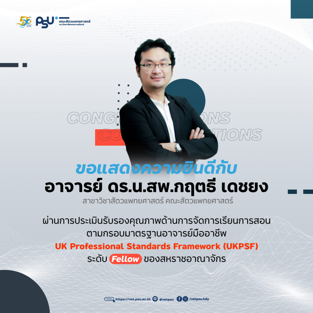 ขอแสดงความยินดีกับอาจารย์ ดร.น.สพ.กฤตธี เดชยง ผ่านการประเมินรับรองคุณภาพด้านการจัดการเรียนการสอน ตามกรอบมาตรฐานอาจารย์มืออาชีพ UK Professional Standards Framework (#UKPSF) ระดับ #Fellow ของสหราชอาณาจักร 🌟