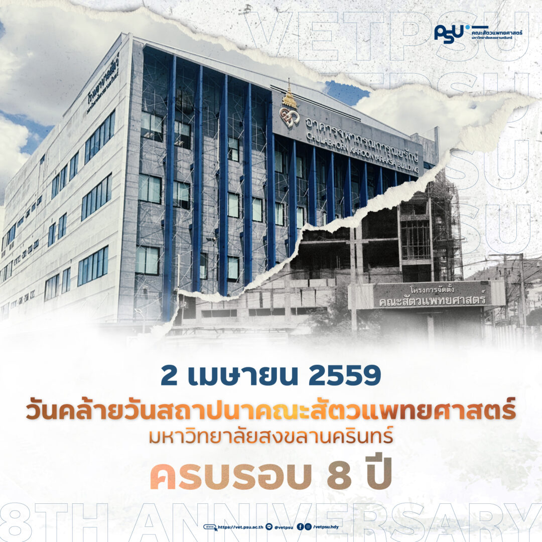 2 เมษายน 2559 วันคล้ายวันสถาปนาคณะสัตวแพทยศาสตร์ มหาวิทยาลัยสงขลานครินทร์ ครบรอบ 8 ปี“คณะสัตวแพทยศาสตร์ เป็นคณะเพื่อนวัตกรรม ที่มีความเป็นเลิศทางวิชาการ เป็นกลไกหลักในการพัฒนาสัตวแพทย์ภาคใต้และประเทศ”.#ฝ่ายวิเทศสัมพันธ์และสื่อสารองค์กรคณะสัตวแพทยศาสตร์ มหาวิทยาลัยสงขลานครินทร์ #VETPSULine : @vetpsu [ https://lin.ee/PpOe4Ps ]โทร : 0 7428 9600 More To Explore