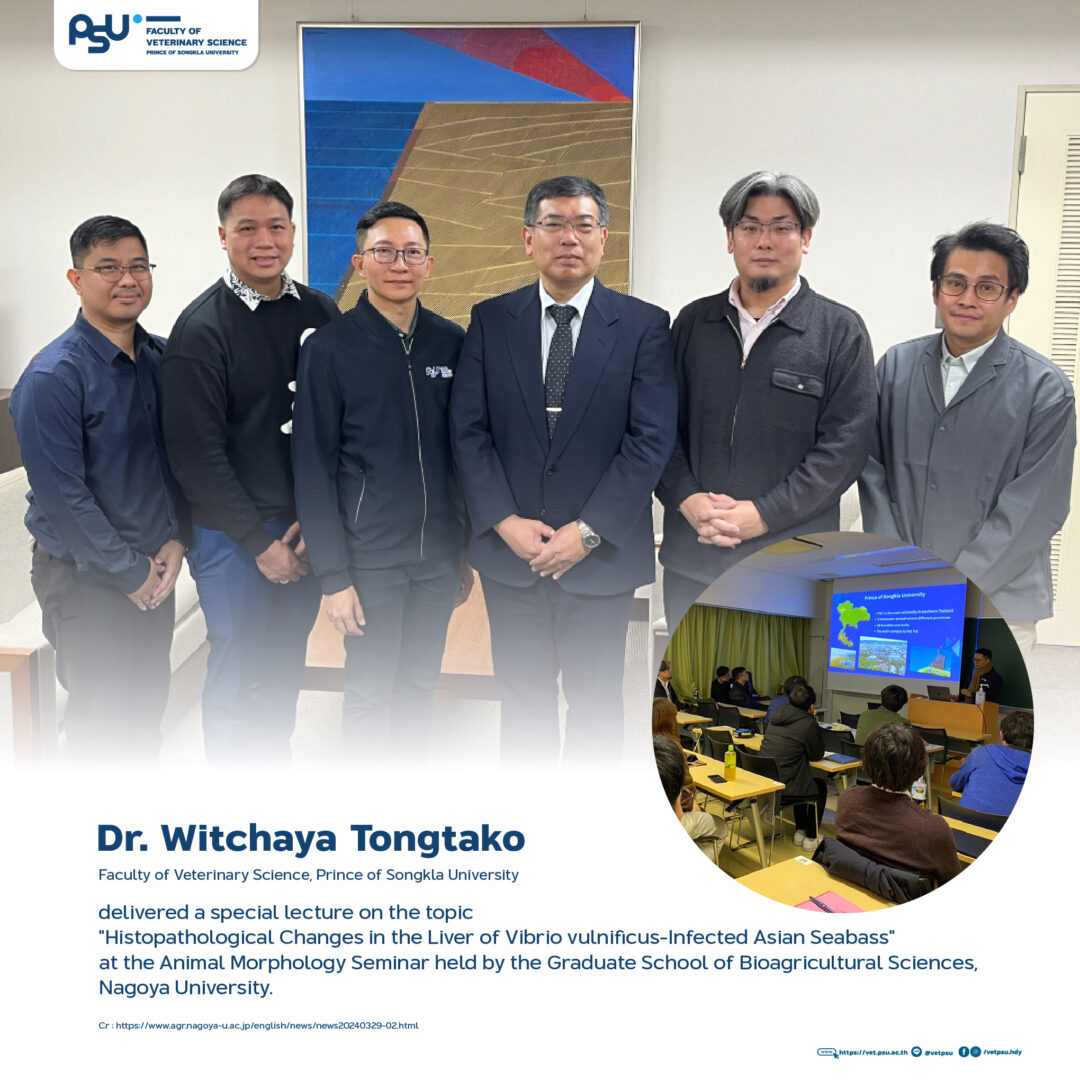 เมื่อวันที่ 26 มีนาคม 2567 ที่ผ่านมา ดร.น.สพ.วิชญะ ทองตะโก อาจารย์ประจำสาขาวิชาสัตวแพทยศาสตร์ บรรยายพิเศษในหัวข้อ Histopathological change in the liver of Vibrio vulnificus infected in Asian seabass ในงานสัมมนา Animal Morphology Seminar (Graduate School of Bioagricultural Sciences, Nagoya University).#ฝ่ายวิเทศสัมพันธ์และสื่อสารองค์กรคณะสัตวแพทยศาสตร์ มหาวิทยาลัยสงขลานครินทร์ #VETPSULine : @vetpsu [ https://lin.ee/PpOe4Ps ]โทร : 0 7428 9650.On March 26th, 2024Dr. Witchaya Tongtako, Department of Veterinary Sciences, Faculty of Veterinary Science, Prince […]
