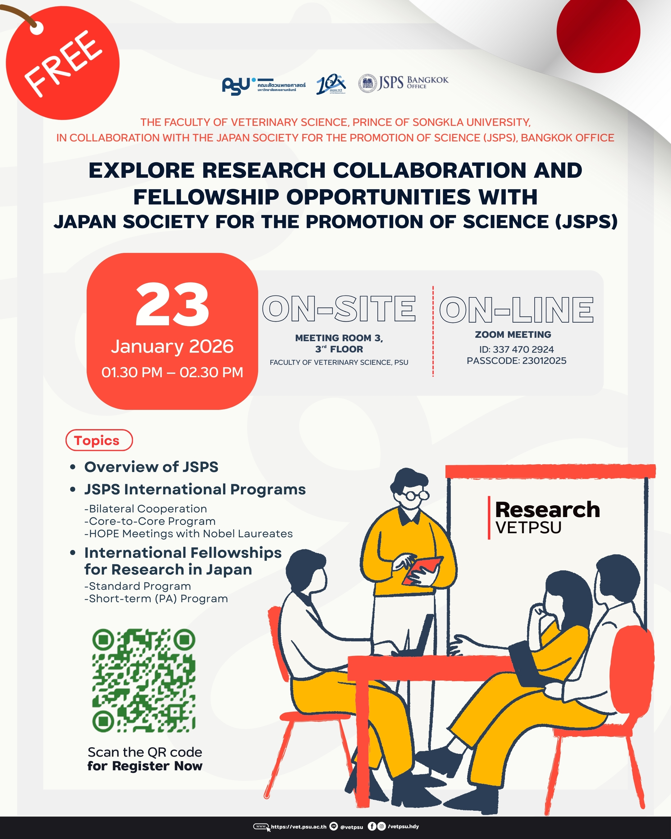 🎓🌏 คณะสัตวแพทยศาสตร์ ม.อ. เปิดเวทีเจาะลึกโอกาสวิจัยนานาชาติ และทุนจาก JSPS.เมื่อวันที่ 23 มกราคม 2569 เวลา 13.30–14.30 น. คณะสัตวแพทยศาสตร์ ม.อ.ร่วมกับ Japan Society for the Promotion of Science (JSPS) สำนักงานกรุงเทพมหานคร 🇯🇵 จัดกิจกรรมบรรยายเกี่ยวกับ โอกาสความร่วมมือด้านการวิจัยระดับนานาชาติ และโครงการทุนของ JSPS ณ ห้องประชุม 3 ชั้น 3 และผ่านระบบ Online Zoom 💻.ในการนี้ได้รับเกียรติจาก🎤 Professor Yoshio Otani ผู้อำนวยการ JSPS สำนักงานกรุงเทพมหานคร🎤 Miss DAI Lipingร่วมเป็นวิทยากรถ่ายทอดความรู้เกี่ยวกับโครงการนานาชาติของ JSPS รวมถึงการประชาสัมพันธ์ทุนวิจัย และโอกาสศึกษาต่อในประเทศญี่ปุ่น 🇯🇵📚 กิจกรรมดังกล่าวจัดขึ้นเพื่อเปิดโอกาสให้นักวิจัย บุคลากร และผู้ที่สนใจ 👩🔬👨🔬ได้รับข้อมูลโดยตรงจาก JSPS ซึ่งเป็นองค์กรของรัฐบาลญี่ปุ่นที่มีบทบาทสำคัญในการสนับสนุนและส่งเสริมงานวิจัยและนักวิจัยทั้งในประเทศญี่ปุ่นและในระดับนานาชาติ […]