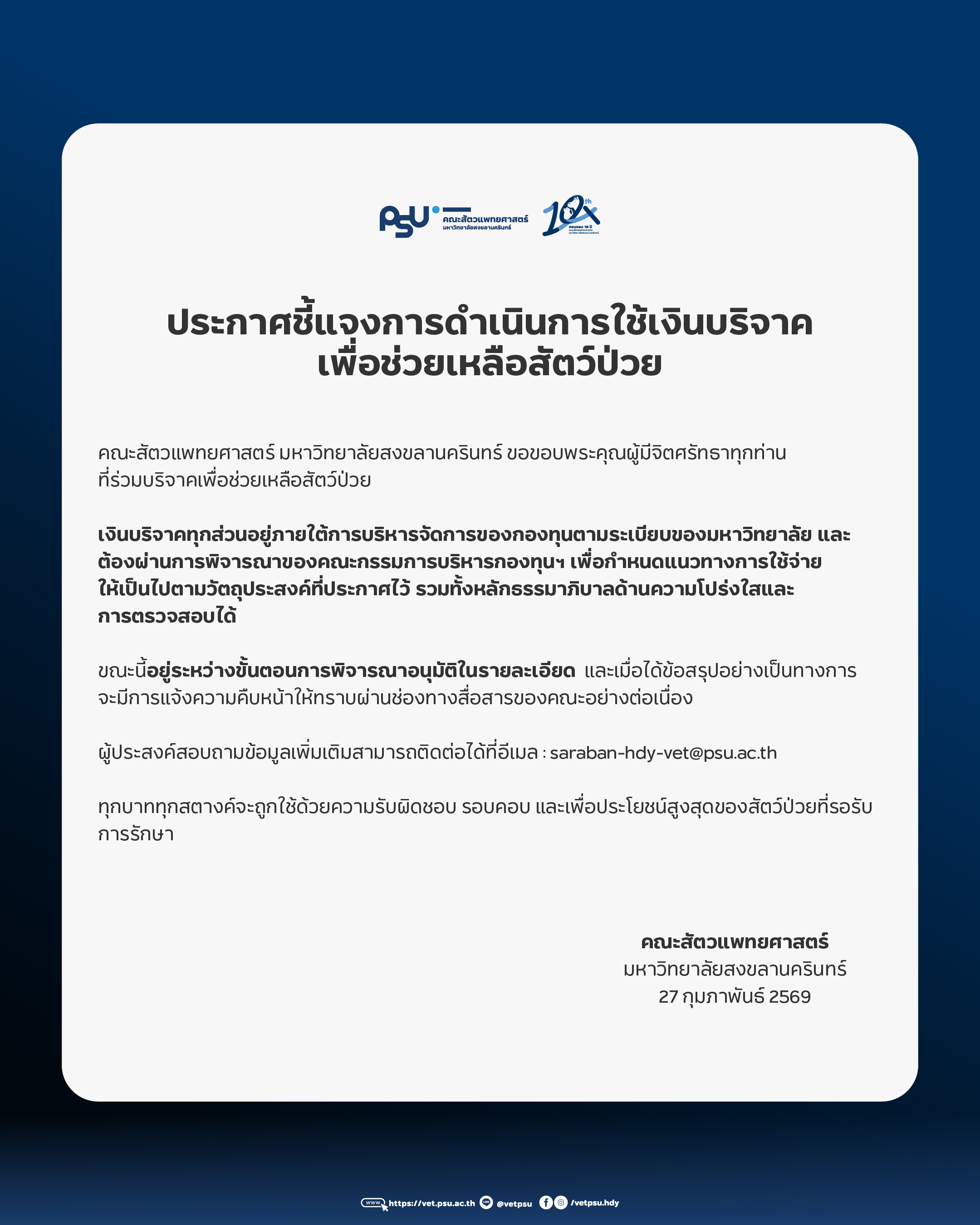 ทุกความเมตตาของท่าน คือความหวังของสัตว์ป่วย.คณะสัตวแพทยศาสตร์ ม.อ. ขอขอบพระคุณผู้มีจิตศรัทธาทุกท่านที่ร่วมบริจาคเพื่อช่วยเหลือสัตว์ป่วย ทั้งนี้ เงินบริจาคทุกส่วนอยู่ภายใต้การบริหารจัดการของกองทุนตามระเบียบของมหาวิทยาลัย และต้องผ่านการพิจารณาของคณะกรรมการบริหารกองทุนฯ เพื่อกำหนดแนวทางการใช้จ่ายให้เป็นไปตามวัตถุประสงค์ที่ประกาศไว้ รวมทั้งหลักธรรมาภิบาลด้านความโปร่งใสและการตรวจสอบได้ ขณะนี้อยู่ระหว่างขั้นตอนการพิจารณาอนุมัติในรายละเอียด และเมื่อได้ข้อสรุปอย่างเป็นทางการ จะมีการแจ้งความคืบหน้าให้ทราบผ่านช่องทางสื่อสารของคณะอย่างต่อเนื่อง ผู้ประสงค์สอบถามข้อมูลเพิ่มเติมสามารถติดต่อได้ที่อีเมล : saraban-hdy-vet@psu.ac.th.ทุกบาททุกสตางค์จะถูกใช้ด้วยความรับผิดชอบ รอบคอบ และเพื่อประโยชน์สูงสุดของสัตว์ป่วยที่รอรับการรักษา 💙🐾.#ก้าวสู่1ทศวรรษสัตวแพทย์มอ #Anniversary10YearsVetPSU #VetForUsVetForAllคณะสัตวแพทยศาสตร์ มหาวิทยาลัยสงขลานครินทร์ #VETPSULine : @vetpsu https://lin.ee/PpOe4Ps More To Explore