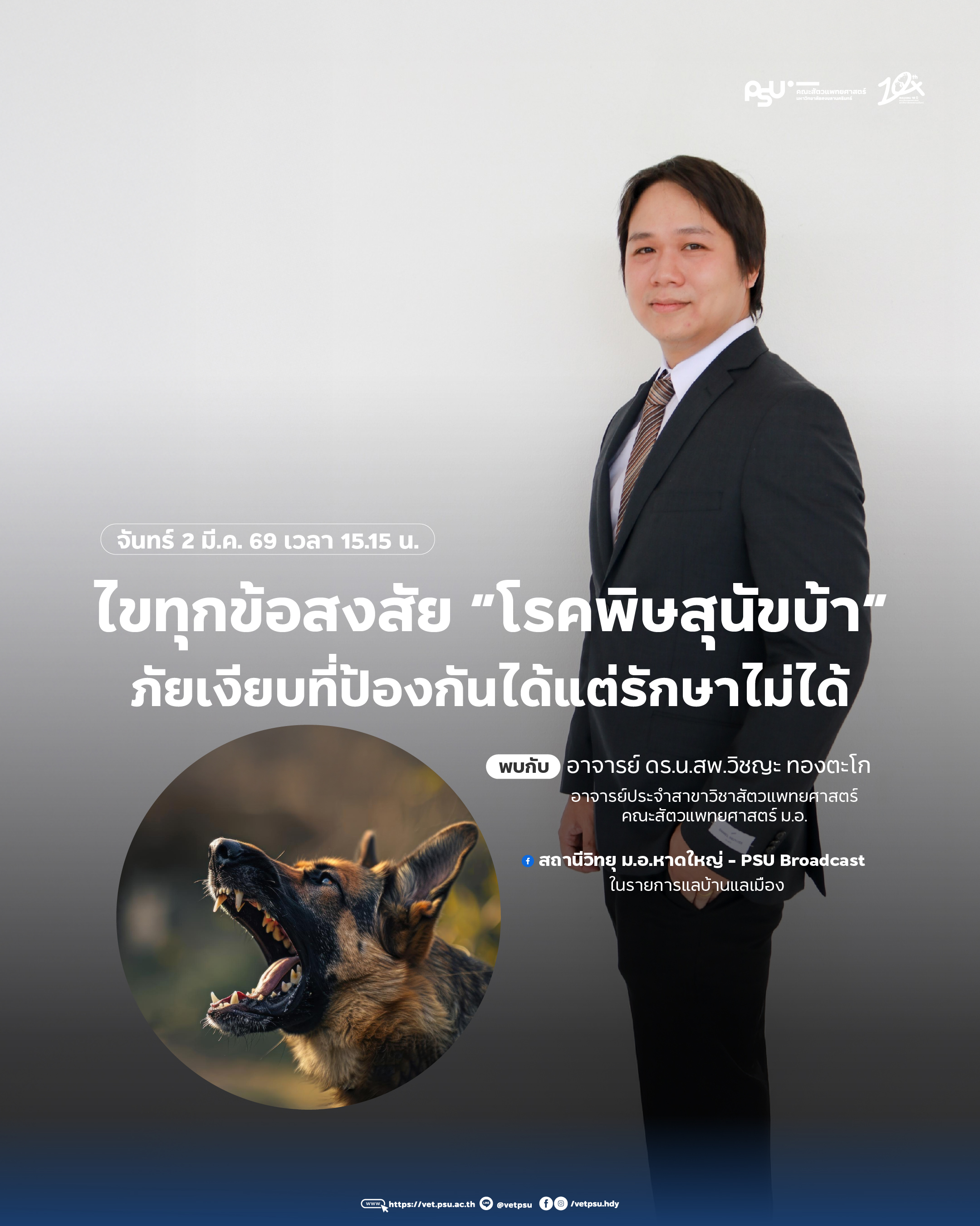 🐶⚠️ “ไข้หัดสุนัข” ไม่ใช่เรื่องไกลตัว กับสถานการณ์การระบาดข้ามสายพันธุ์ที่กำลังเป็นประเด็นสำคัญ.โรคที่หลายคนคิดว่าเกิดเฉพาะในสุนัข อาจส่งผลกระทบกว้างกว่าที่คาดคิด!คนเลี้ยงสัตว์ควรรู้เท่าทันอาการ การป้องกัน และแนวโน้มการแพร่ระบาด เพื่อปกป้องทั้งสัตว์เลี้ยงที่คุณรัก และความปลอดภัยของสังคม 🐾.🎙 ร่วมรับฟังข้อมูลดีๆจาก : อาจารย์ ดร.สพ.ญ.สิเรียม ศุขสวัสดิ์ ณ อยุธยาอาจารย์ประจำสาขาวิชาสัตวแพทยศาสตร์ คณะสัตวแพทยศาสตร์ ม.อ. 📅 ในวันพุธ 4 มี.ค. 69 เวลา 11.00–11.30 น.📺 ทางสถานีโทรทัศน์แห่งประเทศไทย (NBT) ในรายการ NBT มีประเด็น.#ก้าวสู่1ทศวรรษสัตวแพทย์มอ #Anniversary10YearsVetPSU #VetForUsVetForAllคณะสัตวแพทยศาสตร์ มหาวิทยาลัยสงขลานครินทร์ #VETPSULine : @vetpsu https://lin.ee/PpOe4Ps More To Explore
