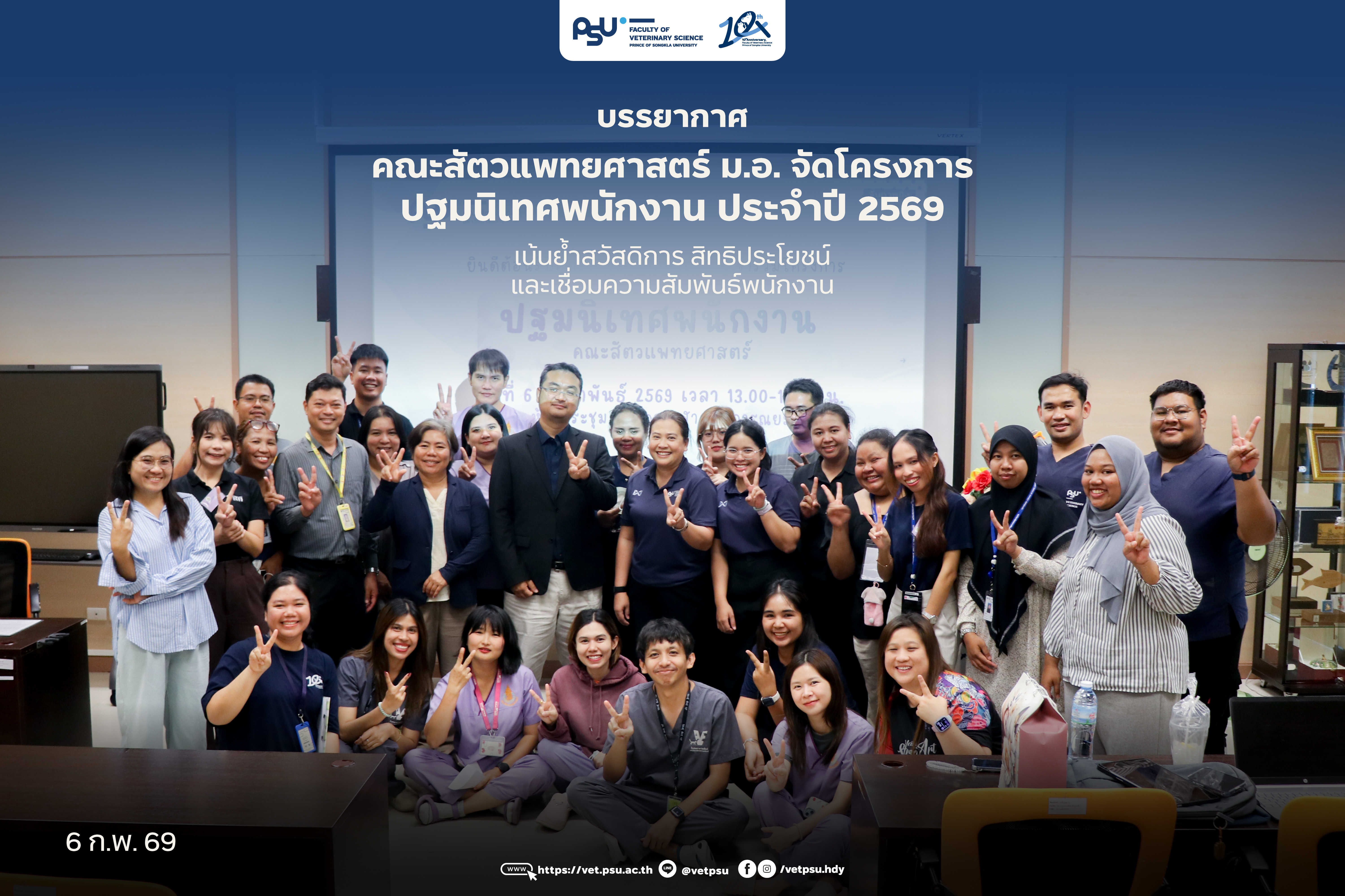 คณะสัตวแพทยศาสตร์ ม.อ. จัดโครงการปฐมนิเทศพนักงาน ประจำปี 2569 เมื่อวันที่ 6 กุมภาพันธ์ 2569 ที่ผ่านมา ได้รับเกียรติจาก ผู้ช่วยศาสตราจารย์ ดร.น.สพ.กฤตธี เดชยง คณบดีคณะสัตวแพทยศาสตร์ กล่าวเปิดโครงการ