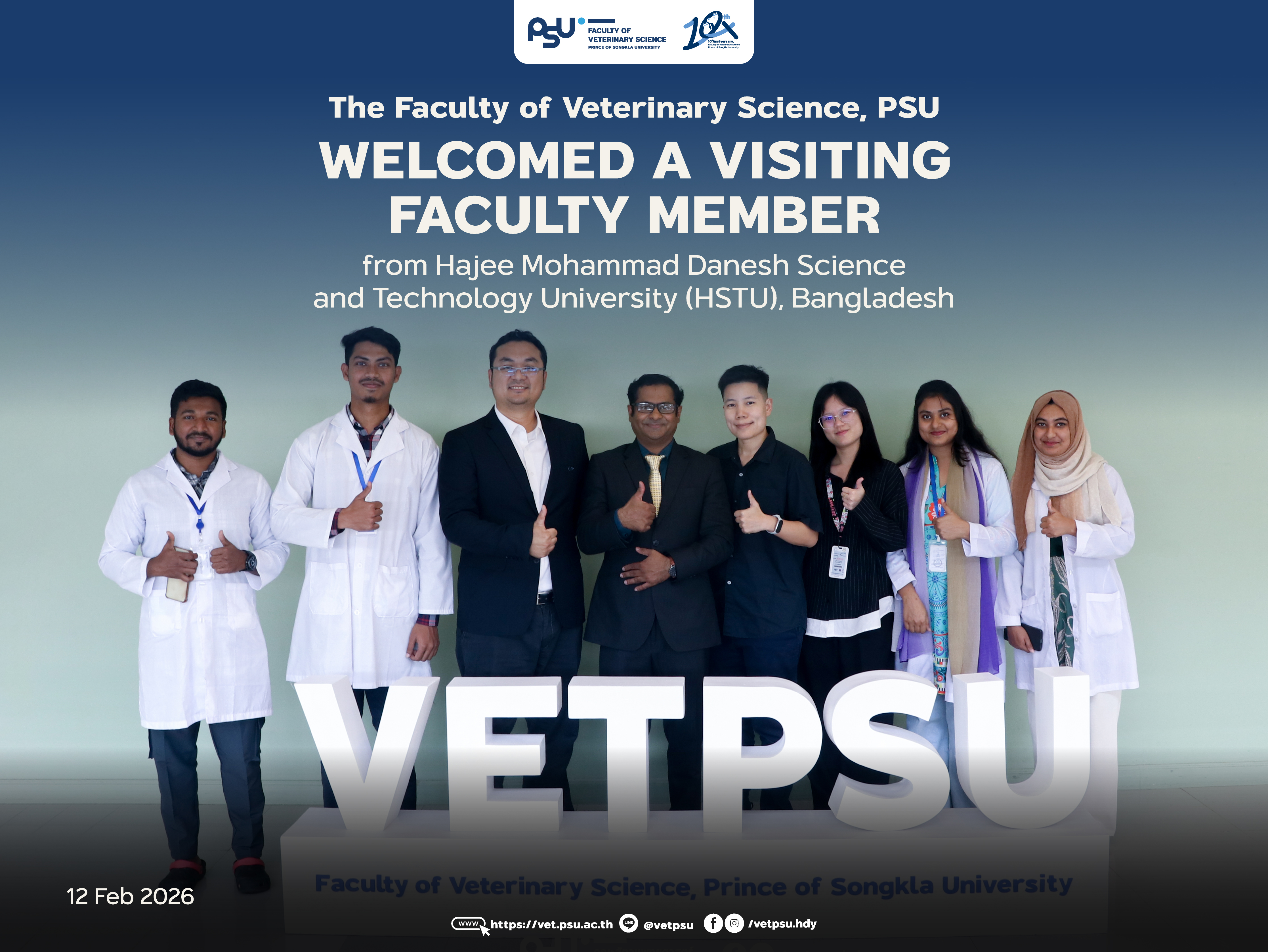 The Faculty of Veterinary Science, Prince of Songkla University warmly welcomed Dr. Md. Atiqul Haque, Associate Professor, Department of Microbiology, Faculty of Veterinary and Animal Science, Hajee Mohammad Danesh Science and Technology University (HSTU), Bangladesh, during his visit to meet and observe HSTU students undertaking their clinical training at the Faculty’s Veterinary Teaching Hospital.