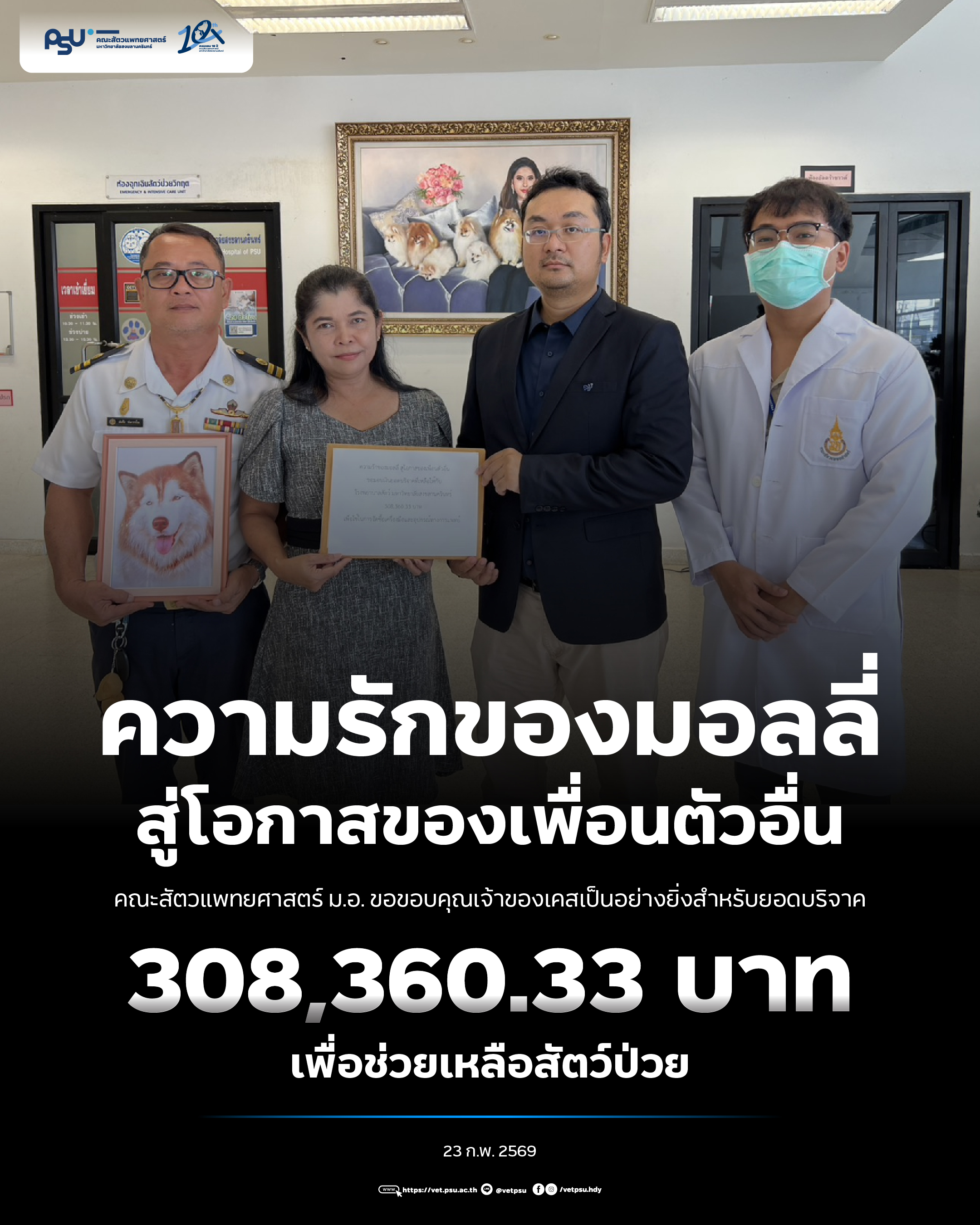 วันนี้ (23 กุมภาพันธ์ 2569) คุณญานิกา ชนะวรรโณ พร้อมสามี เจ้าของเคสของมอลลี่ ได้มอบเงินบริจาคให้แก่ โรงพยาบาลสัตว์ คณะสัตวแพทยศาสตร์ มหาวิทยาลัยสงขลานครินทร์ เป็นจำนวนเงินทั้งสิ้น 308,360.33 บาท เพื่อช่วยเหลือสัตว์ป่วยตัวอื่น ๆ ที่ยังคงรอคอยโอกาสในการรักษา