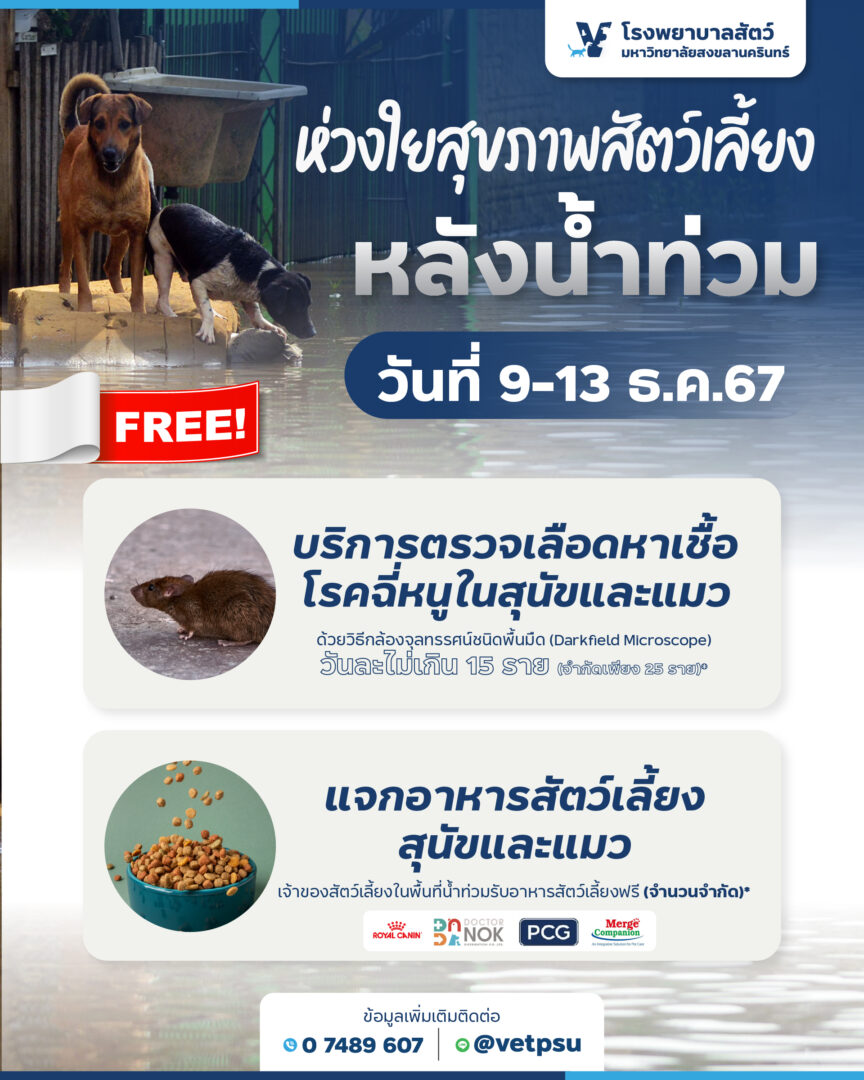 💥 💥 [ #ประชาสัมพันธ์ ] โรงพยาบาลสัตว์ ม.อ. ห่วงใยสุขภาพสัตว์เลี้ยงหลังน้ำท่วม เจ้าของสัตว์เลี้ยงเข้ามารับบริการ #ฟรี 💥💥