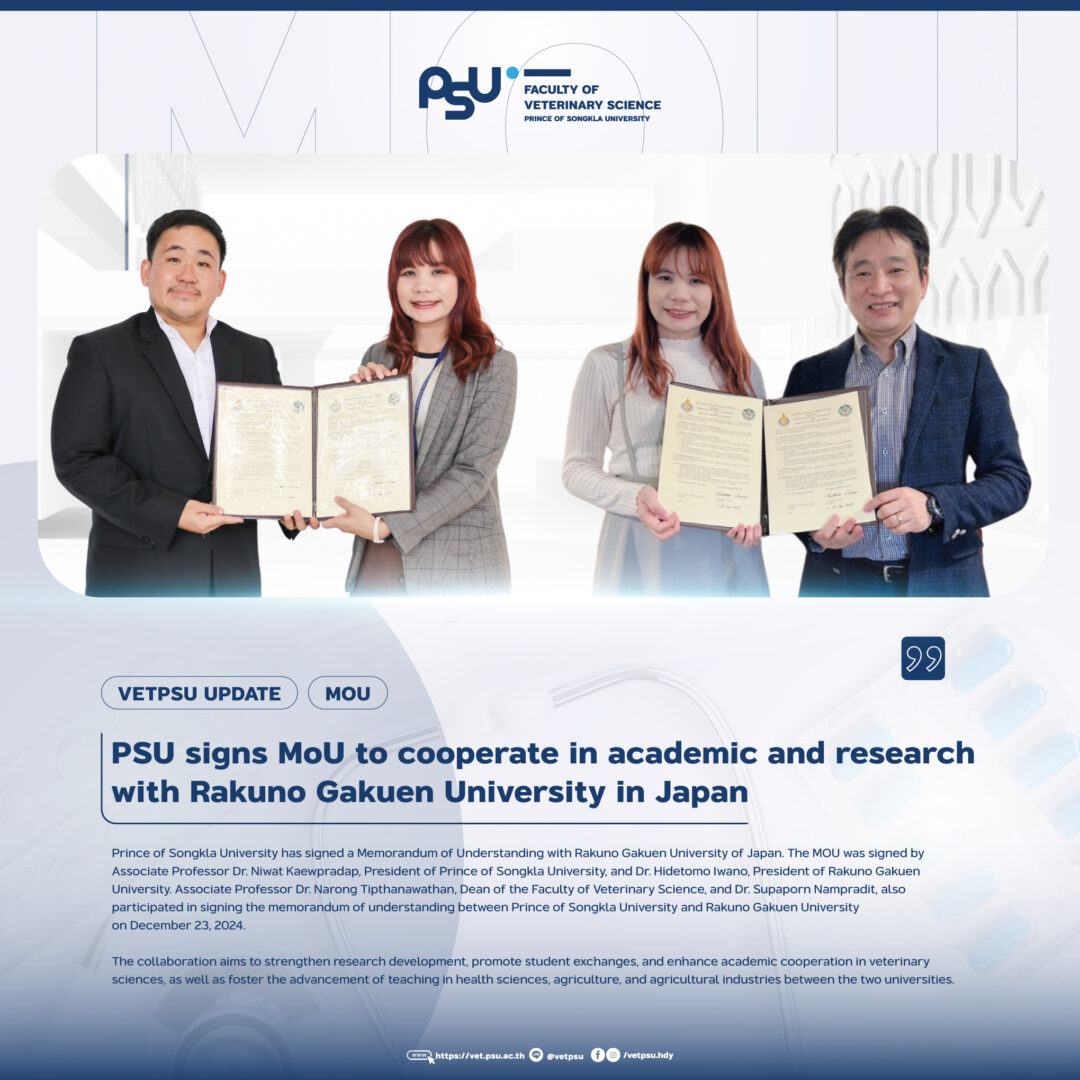 Prince of Songkla University has signed a Memorandum of Understanding with Rakuno Gakuen University of Japan. The MOU was signed by Associate Professor Dr. Niwat Kaewpradap, President of Prince of Songkla University, and Dr. Hidetomo Iwano, President of Rakuno Gakuen University. Associate Professor Dr. Narong Tipthanawathan, Dean of the Faculty of Veterinary Science, and Dr. Supaporn Nampradit, also participated in signing the memorandum of understanding between Prince of Songkla University and Rakuno Gakuen University on December 23, 2024.