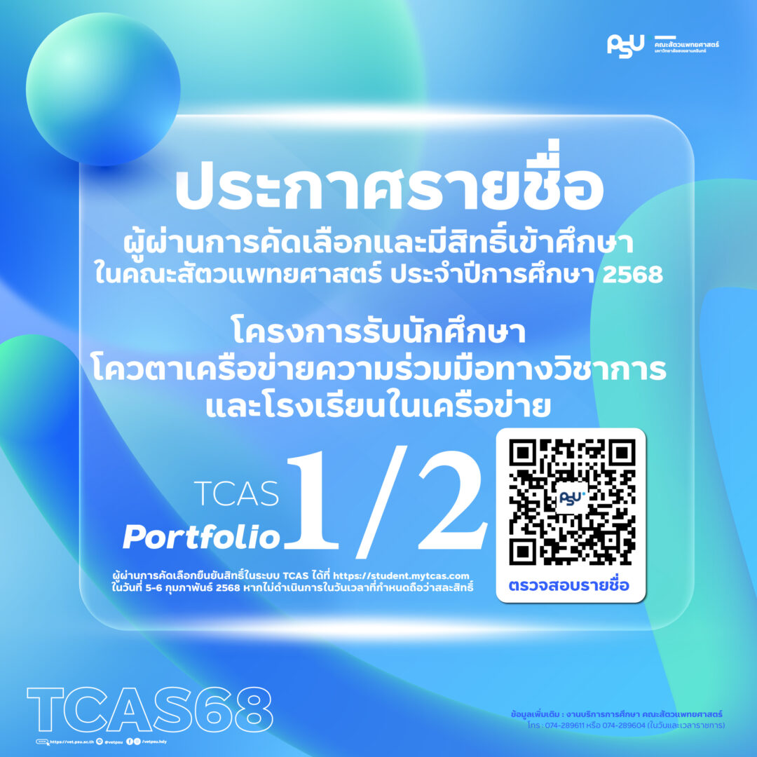 #TCAS68 ] #ประกาศรายชื่อผู้ผ่านการคัดเลือกและมีสิทธิ์เข้าศึกษาในคณะสัตวแพทยศาสตร์ ประจำปีการศึกษา 2568 #โครงการรับนักศึกษาโควตาเครือข่ายความร่วมมือทางวิชาการและโรงเรียนในเครือข่าย #TCAS1/2 #Portfolio 💙